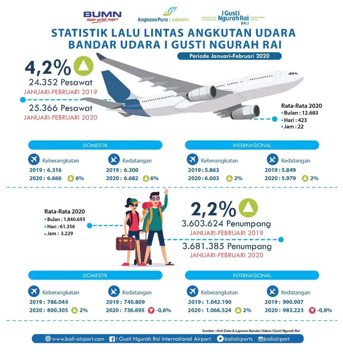 MANGUPURA – Memasuki dua bulan pertama di tahun 2020, Bandar Udara Internasional I Gusti Ngurah Rai – Bali mencatat telah melayani sebanyak 3,68 juta penumpang serta 25 ribu pergerakan pesawat udara.
