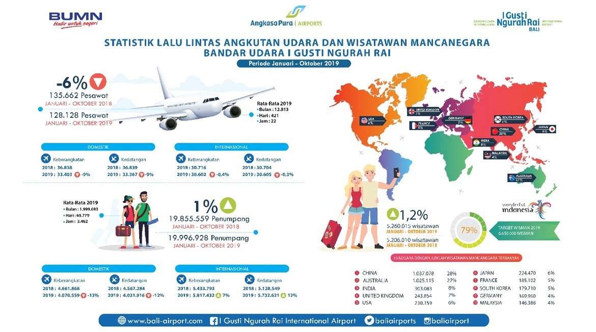 General Manager PT Angkasa Pura I (Persero) Bandar Udara Internasional I Gusti Ngurah Rai – Bali, Herry A.Y. Sikado, mengungkapkan bahwa jumlah penumpang pada periode Januari hingga Oktober 2019 ini didominasi oleh penumpang rute internasional.