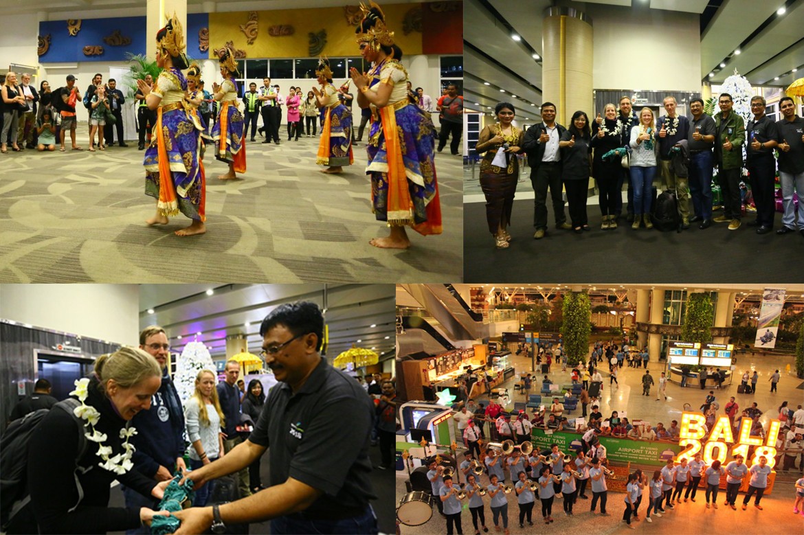Tidak hanya yang berangkat, penumpang yang datang pertama di tahun 2018 pun mendapat sambutan meriah dari seluruh jajaran manajerial Bandara I Gusti Ngurah Rai.