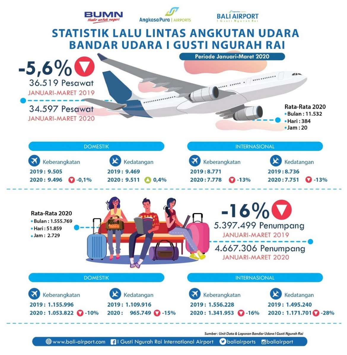 Selama tiga bulan pertama di tahun 2020, sebanyak 4.667.306 penumpang tercatat keluar masuk Pulau Bali melalui bandar udara yang terangkut melalui 34.597 pergerakan pesawat udara. Jika dibandingkan dengan pencatatan di periode yang sama di tahun 2019, tercatat terdapat penurunan jumlah penumpang serta jumlah pergerakan pesawat yang dilayani oleh Bandar Udara Internasional I Gusti Ngurah Rai – Bali.